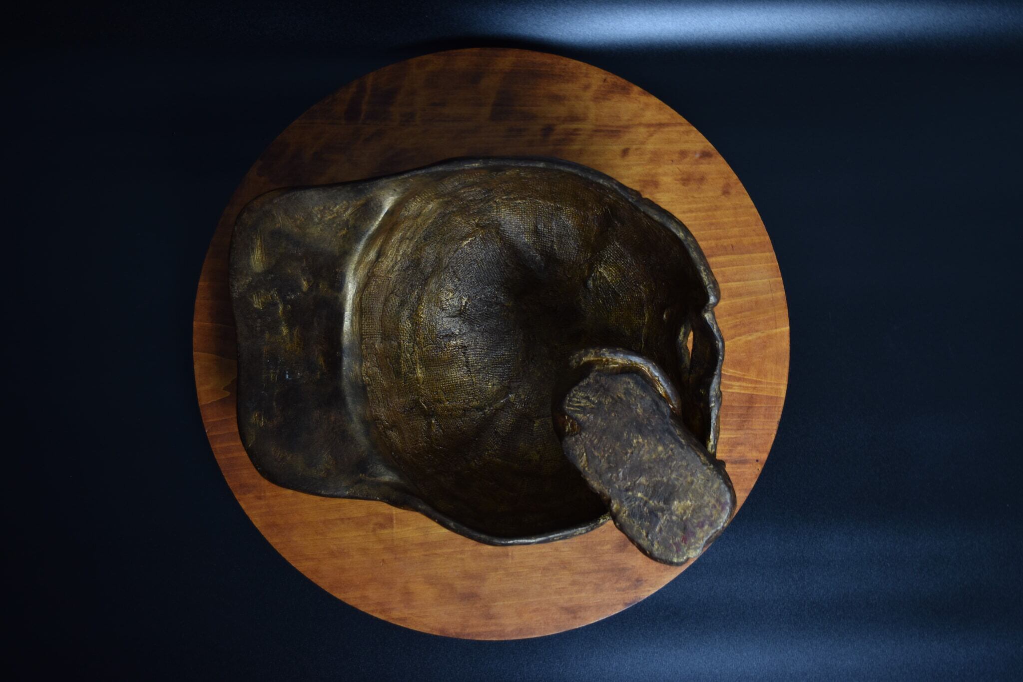 十二支が日常の中に隠れていて、私たちを見守っていることを表した作品です。帽子の文字の中に、十二支の「子」が隠れていることから想を得ています。外を元気に走り回る子どもが使い古した帽子に、子を祀りました。