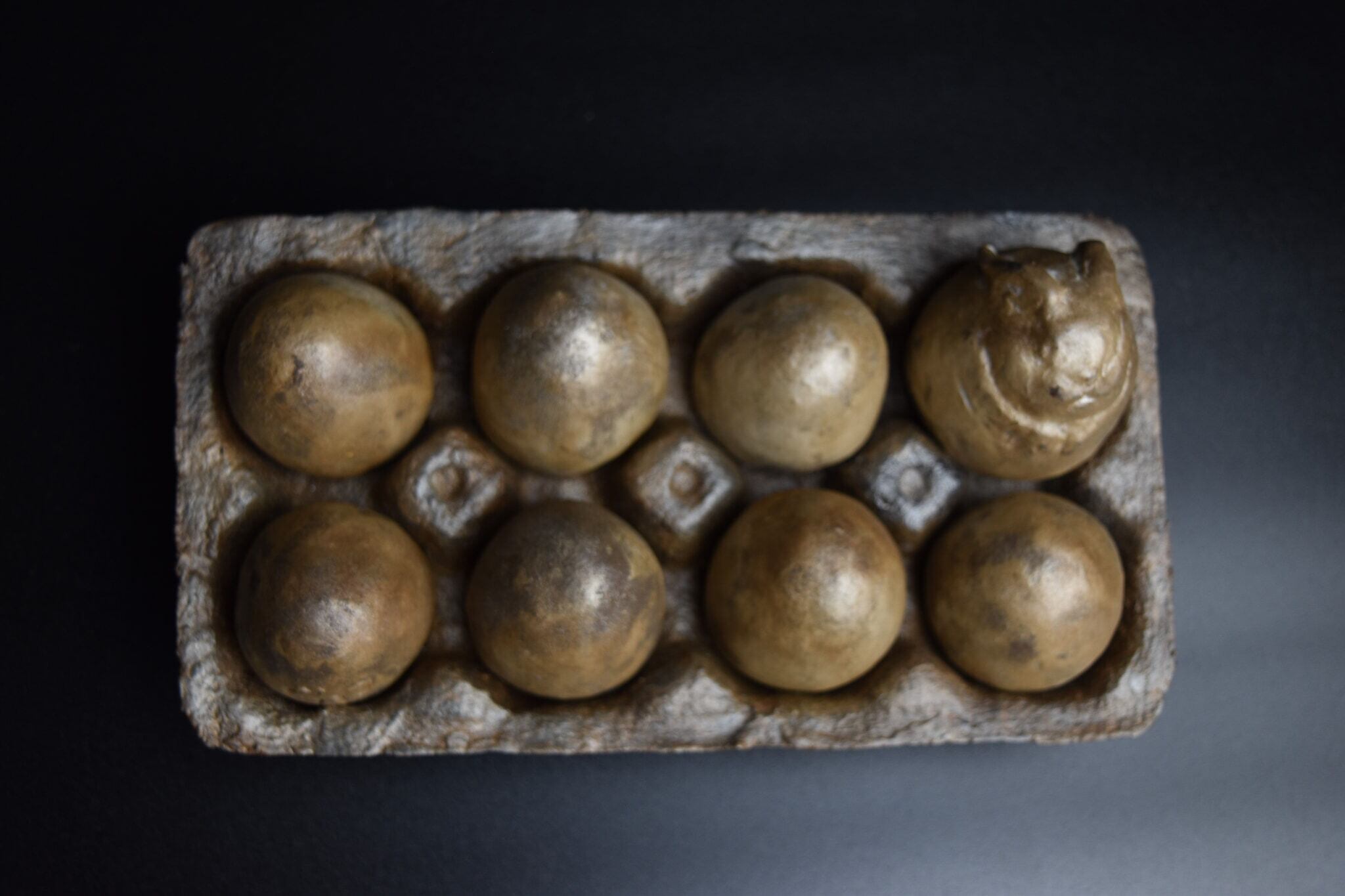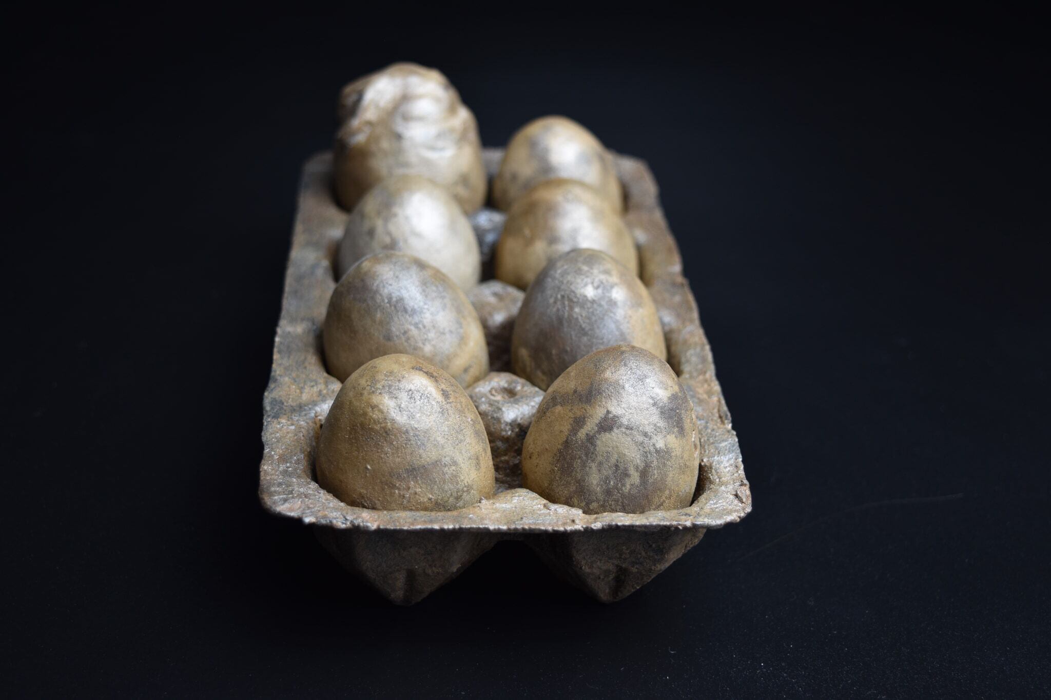十二支が日常の中に隠れていて、私たちを見守っていることを表した作品です。卵の文字に、十二支の「卯」が隠れていることから想を得ています。冷蔵庫を開ければ、いつもそこにある卵に、卯を祀りました。