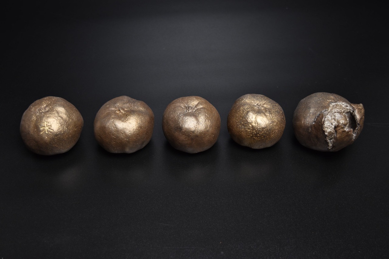十二支が日常の中に隠れていて、私たちを見守っていることを表した作品です。果物の「果」の字に、十二支の「未」が隠れていることから想を得ています。夏にスイカ、冬にミカン、一年に彩を添えてくれる果物に、未を祀りました。