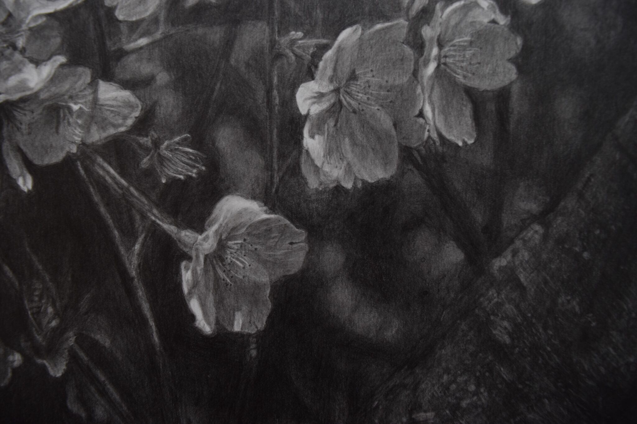 桜のはかなくも美しい姿を、一枚の絵の中にストーリーを立てて描きました。生まれる予兆、誕生、謳歌、衰退、そして散る様の中にある、それぞれの心情を感じていただければ幸いです。